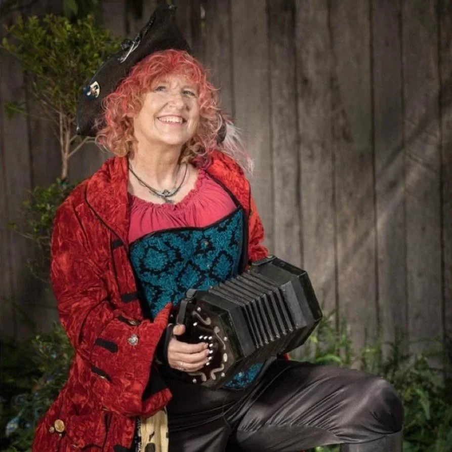 Gather ’round, ye hearty souls, as Scupper fills the air with sweet tunes from her concertina. Her fingers dance on the keys, conjuring melodies that beckon sailors and landlubbers alike to join her merry crew. You might also catch her as she weaves through the village lanes, swaying to the rhythm of adventure, mingling her music with the fairy laughter and market chatter. Each note summons visions of doubloons and treasure hunts under the moon's watchful eye. YARRRR!